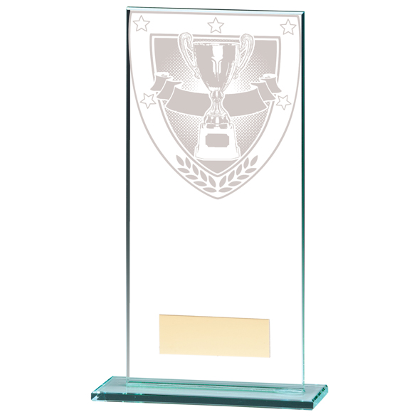 Whatever the occasion or award, this neat glass trophy is sure to fit the bill. With a generic white printed self-adhesive image of a trophy cup set inside a shield shape frame, the Millennium Achievement Jade Glass Award offers a flexible, stylish design to complement any prize giving event. Made from a budget 5mm thick jade toned glass, the flawless rectangular award stands on a slim plinth and is available in a range of 6 sizes, with each one supplied with the option to add a personalised message.